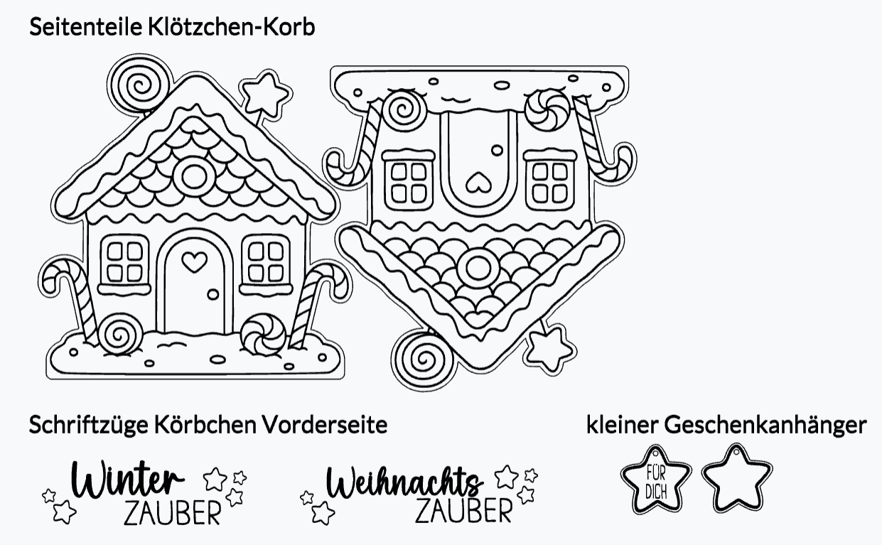 Diese Laserdatei „Lebkuchenhaus“ ist perfekt geeignet, um ein dekoratives Körbchen aus Holzklötzchen mit gelaserten Lebkuchenhaus-Elementen zu erstellen – ideal als liebevolle Geschenkverpackung oder festliche Tischdekoration. 🎁🎄